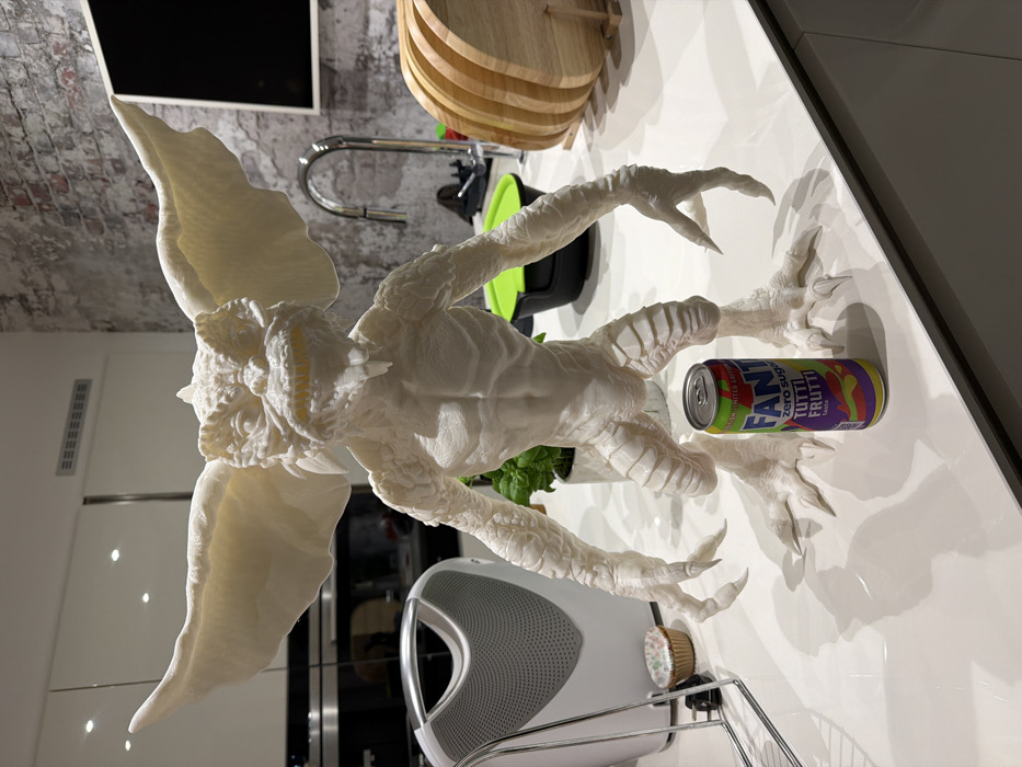 A large, white, intricately detailed statue of a winged creature resembling a Mogwai stands on a white countertop