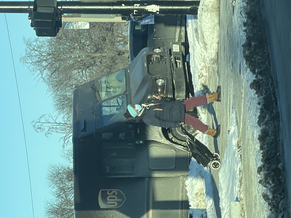 A UPS delivery truck is parked on a snowy street. A person wearing a face mask, dark coat, and maroon pants stands near the truck’s open door. They are holding a black stroller-like bag. There is snow on the sidewalk and street side. A traffic light is visible above the truck, with bare trees in the background against a clear blue sky.