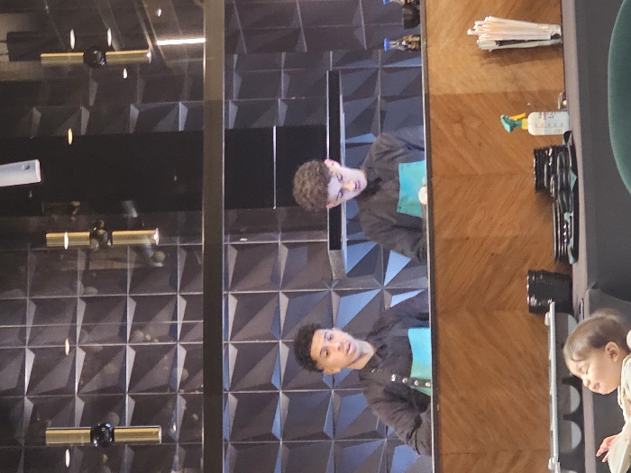 A mirrored bar reflects a young man in a black shirt and blue apron