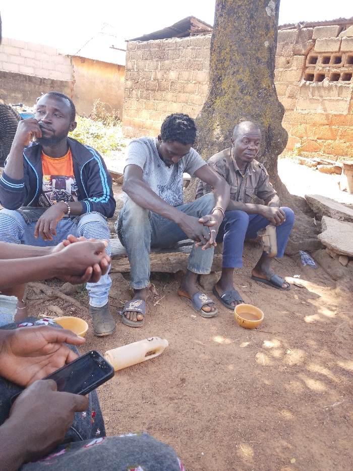 An outdoor scene in Vodni, Nigeria, features four adult males gathered on dry, reddish-brown earth under bright daylight. Three men are visibly seated, two on a low, irregular stone or wooden structure, and one on the ground adjacent to a large, moss-covered tree trunk on the right. From left to right: A partially visible individual in the immediate foreground, wearing dark patterned clothing, holds a black smartphone with both hands. A yellow bowl is on the ground near their left knee. Next to them, a man with a dark beard wears a dark blue zip-up jacket with light blue stripes over an orange t-shirt, and ripped blue jeans. His left hand is raised to his chin, indicating a pensive or resting posture. To his right, a man with dark, curly hair wears a light gray t-shirt with a dark graphic and blue jeans. He looks downwards, his hands clasped in front of him. He wears dark blue patterned slide sandals. The furthest visible man on the right, with a shaved head, wears a brown short-sleeved collared shirt and blue trousers, with black slide sandals. He sits near the base of the tree trunk and holds a light-colored, possibly plastic, elongated object on his lap. On the ground between the center and right men, another yellow bowl contains a brown liquid and has "ME" inscribed on its side. A light-colored plastic bottle lies horizontally on the ground in the lower-center. The background consists of several low-rise structures constructed from unrendered clay bricks, some topped with corrugated metal roofing. The overall environment appears semi-urban or rural, characterized by basic construction and dry ground.