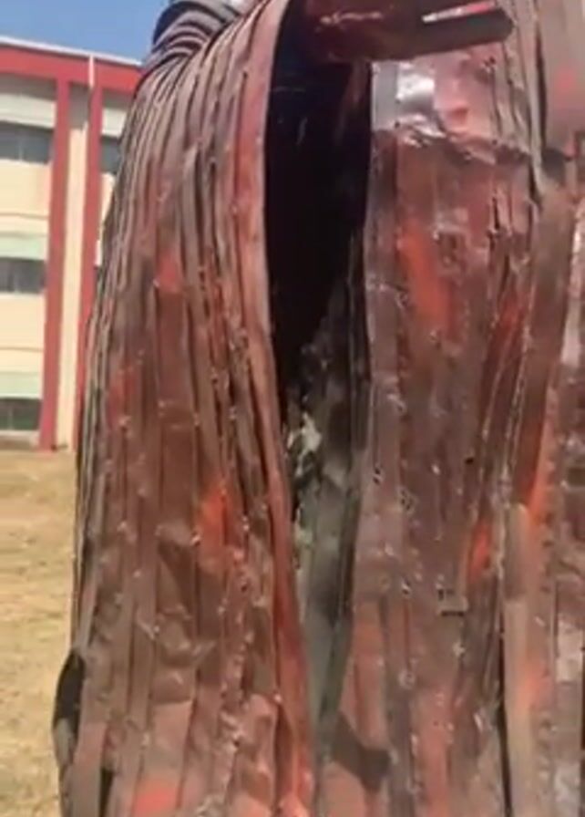 tall, full-body statue of a man wearing a turban and long, flowing robes. The statue appears to be made of metal strips and is reddish-brown in color, with some parts seemingly painted red. The man's hands are visible and positioned as if in a gesture. The statue is located outdoors on a grassy area. A building with red trim and multiple windows is visible in the background under a clear blue sky.