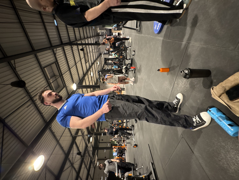 The image portrays the interior of a fitness center located in Hœnheim, France. The foreground is dominated by a male individual, appearing to be in his 20s-30s, with a beard and dark, curly hair. He is positioned slightly off-center, facing forward but looking downwards and to his left, wearing a blue Adidas short-sleeved t-shirt, dark, loose-fitting track pants, and black and white high-top sneakers. His hands are near his pockets. To his right, partially visible, is the upper torso and bald head of another male, wearing a black t-shirt and black pants with white vertical stripes; a blue weight plate rests on the floor near his feet. On the dark gray rubber mat flooring in the immediate foreground, a blue patterned water bottle, a brown towel with a black smartphone, and a black shaker bottle are present. An orange water bottle is positioned further back on the floor. The environment features a high, light gray corrugated metal ceiling with exposed black structural beams and multiple recessed overhead lights. Numerous other individuals, male and female, are dispersed throughout the facility, engaged in various workout activities. Gym equipment, including weight racks, barbells, benches, and resistance machines (some with orange accents), is visible across the midground and background.