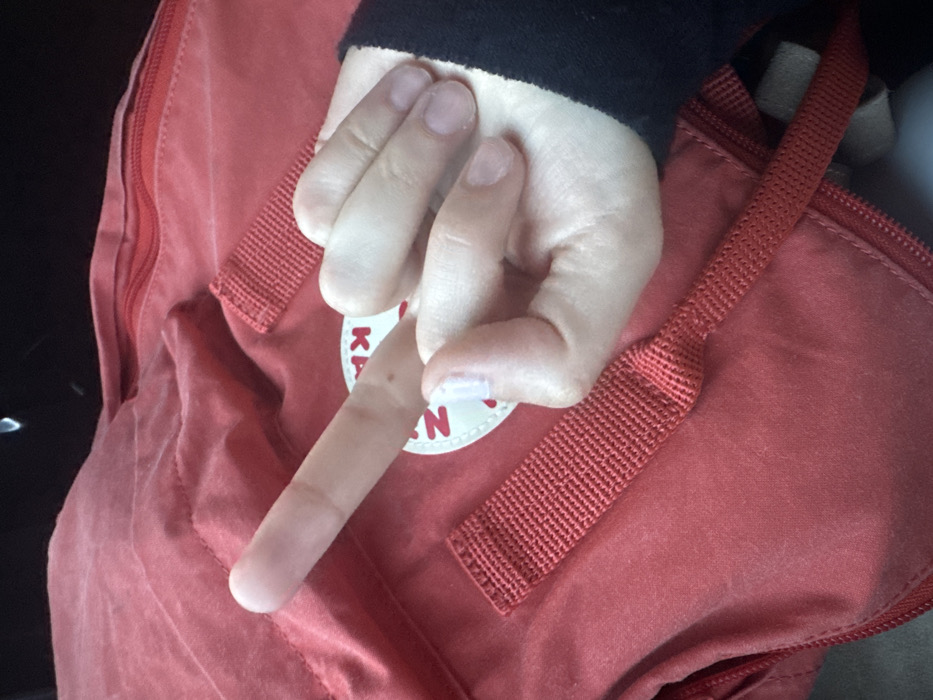 A hand rests on a reddish-brown backpack. The hand has light skin and short, unpainted fingernails. A small, clear bandage is visible on the tip of the index finger. The backpack features a visible zipper and a woven strap. A circular patch with the letters "KA" and "N" is partially visible under the extended index finger. A dark sleeve is visible above the hand.
