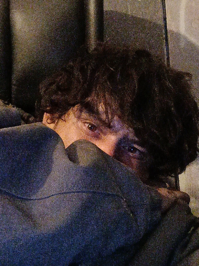 A person peers from behind a grey hoodie, only their eyes and part of their nose visible. They have dark, curly hair that frames their face. The background is blurred and appears to be a dark wall. The image is grainy. The person is indoors.