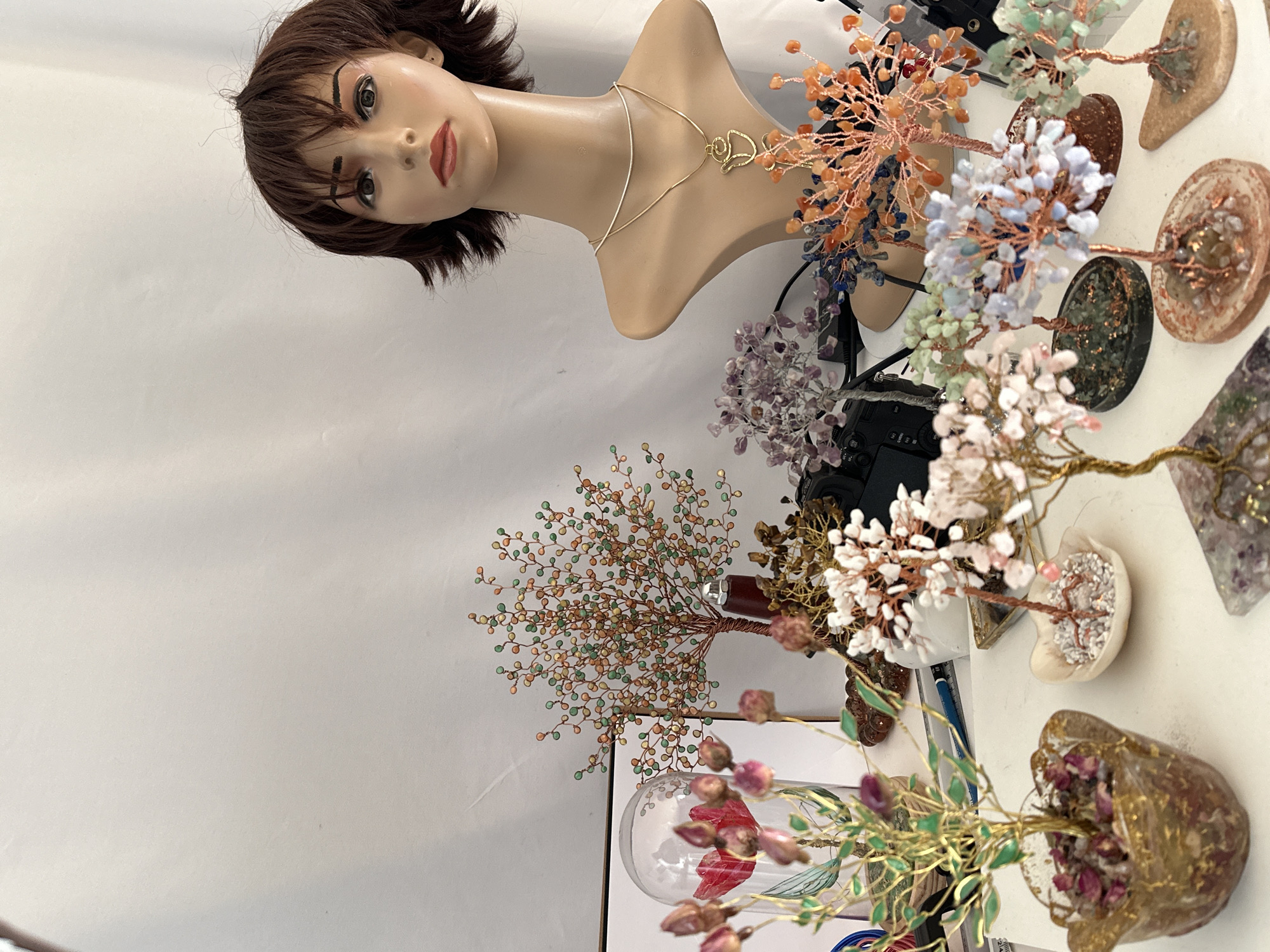 This image depicts a static indoor display of handcrafted items on a white surface, set against a plain white backdrop, in Marcoussis, France. The scene features a light-skinned female mannequin bust positioned on the right, facing forward. The mannequin has short, dark brown hair (wig), painted eyebrows, eyeshadow, and red lipstick. It wears two necklaces: an upper, plain silver-colored chain and a lower, longer gold-colored chain with a prominent gold-colored pendant shaped like a teapot. The primary subjects on the white surface are numerous small, ornamental "gemstone trees" or "bonsai-style wire trees." These trees consist of twisted wire, predominantly copper-colored, forming trunks and branches, adorned with small beads or polished chips of various colored stones, simulating leaves. The colors of these "leaves" include a mix of light green and orange, various shades of purple (amethyst-like), vibrant orange (carnelian-like), light pink/white, light blue/celestite, and darker green. Each tree is set on a distinct base, such as small resin pots, stone slabs, or oval resin bases often containing embedded chips. Other objects visible in the display include: * On the far left, a glass cloche (bell jar) covers a red artificial or dried flower. * Several small, delicate ornamental arrangements resembling dried flowers or buds on wire stems are present, one contained within a gold-colored, possibly resin, pot with dried petals. * A dark-colored object, potentially a camera, is partially visible among the trees in the mid-ground. * Writing implements (pens/pencils) and a ruler or straight edge are partially visible on the white surface. * A small, dark-capped vial or bottle is situated behind a larger green and orange tree. * A small, shell-shaped dish holds one of the pink/white trees. The entire setup suggests a retail display, market stall, or craft fair exhibit. No human actions or interactions are depicted.