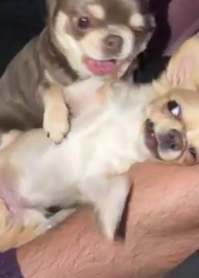 A video shows two small dogs, possibly Chihuahuas, playing on a person's leg