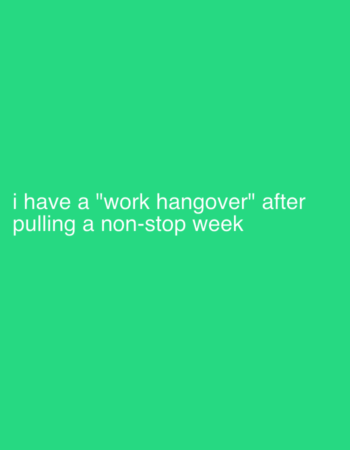 The image is a simple text graphic. The text reads "i have a "work hangover" after pulling a non-stop week" in white against a green background. There are no other elements present. There is no information related to Vozdovac Urban Municipality, Serbia.