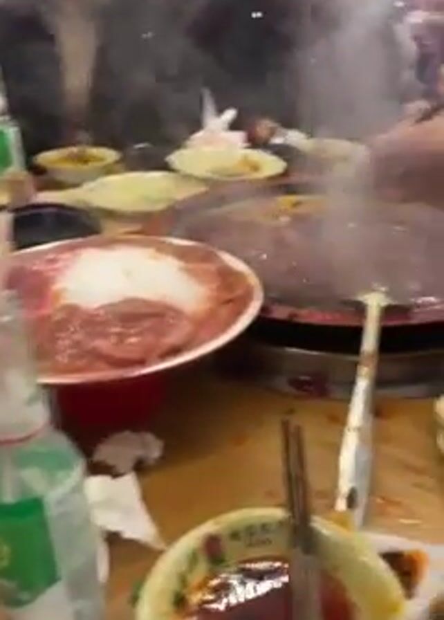 Here is a detailed description of the video: The video shows a group of people enjoying a hot pot meal. A large, round hot pot sits in the middle of the table, steaming and bubbling with a red broth. Someone is using chopsticks to add slices of raw meat from a red and white plate into the hot pot. Other plates of food, bowls of dipping sauce, bottles, and scattered napkins are visible on the table. The people around the table are mostly out of focus, but their voices and excited chatter can be heard. The overall setting suggests a lively and social dining experience.