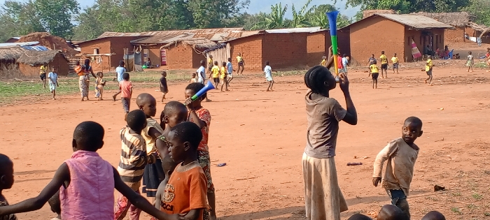 The image depicts an outdoor scene in Ngalula, Democratic Republic of the Congo. The foreground and midground consist of an unpaved reddish-brown dirt expanse with scattered dry vegetation. Approximately 25-30 individuals, predominantly children of various ages, are present. In the foreground, a cluster of children is observed. A child in a light pink sleeveless top is viewed from behind. Adjacent, a child in a patterned red, white, and blue shirt holds a blue and green vuvuzela-like horn to their mouth. To the right, another child in a light brown t-shirt and light-colored skirt holds a similar blue and green horn aloft. A child in a light t-shirt and ripped blue shorts looks towards the right. Other children are partially visible, including one in an orange t-shirt displaying "GUCCI" text. In the midground and background, numerous children are scattered across the dirt area. Several children wear yellow t-shirts and are actively moving, suggestive of play. A female adult, dressed in a patterned wrap skirt and orange top, walks among the children, accompanied by a smaller child and possibly carrying an infant on her back. The background features several single-story residential structures. Most buildings have reddish-brown mud-brick walls and corrugated metal roofs. Some smaller, less defined structures exhibit thatched roofs. Distant green foliage and trees line the horizon beneath a clear light blue sky. Clothes are visible drying on lines or racks outside some of the background buildings.