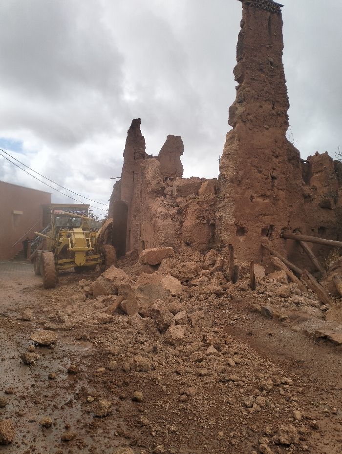 The scene depicts a demolition or clearance operation in Ouaouizert, Morocco, under an overcast sky