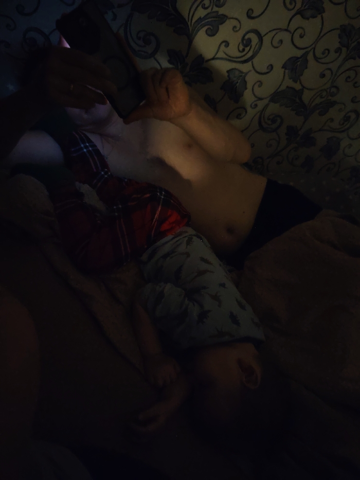 A person lies shirtless in bed, illuminated by a phone they are holding. A child wearing a blue patterned pajama top and red plaid bottoms is positioned near the first person, with the child's head near the foot of the bed. The wallpaper has a floral design, and the overall lighting is dim.