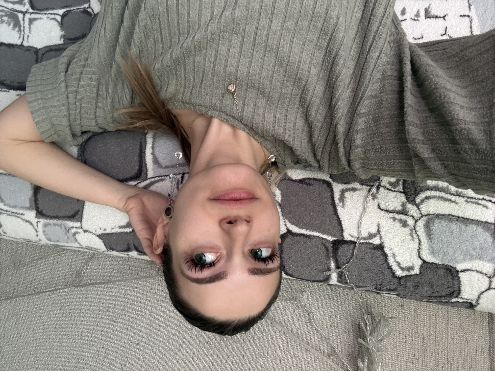 A young woman is lying on her back on a grey and white patterned blanket. She is wearing a green ribbed shirt and has long brown hair. She is wearing earrings and a necklace. The location is unspecified.