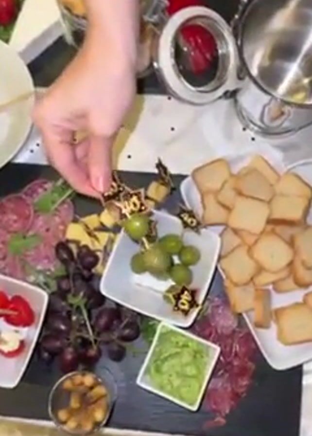Here is a detailed description of the video: The video showcases a food spread set up for a special occasion. A person, wearing a black sequined sleeve, is arranging the food items on a black and white tablecloth. The spread includes two black slates laden with a variety of foods. The first slate has cheeses, cured meats (salami), grapes (purple and green), olives, a green dip (possibly guacamole or pesto), small toast squares, stuffed peppers, and crackers. The second slate has cheeses, cured meats (salami), grapes (purple and green), strawberries, a white dip, small pastries, and stuffed peppers. Also on the table are a stainless steel ice bucket with a bottle of sparkling wine inside, a small bowl of yellow balls (possibly cheese or melon), and a small jar with snacks. The person in the video is seen placing star-shaped toothpicks into the food items, adding a decorative touch. The camera angle is mostly overhead, providing a comprehensive view of the food arrangement and setting. The lighting is bright, highlighting the colors and textures of the food.