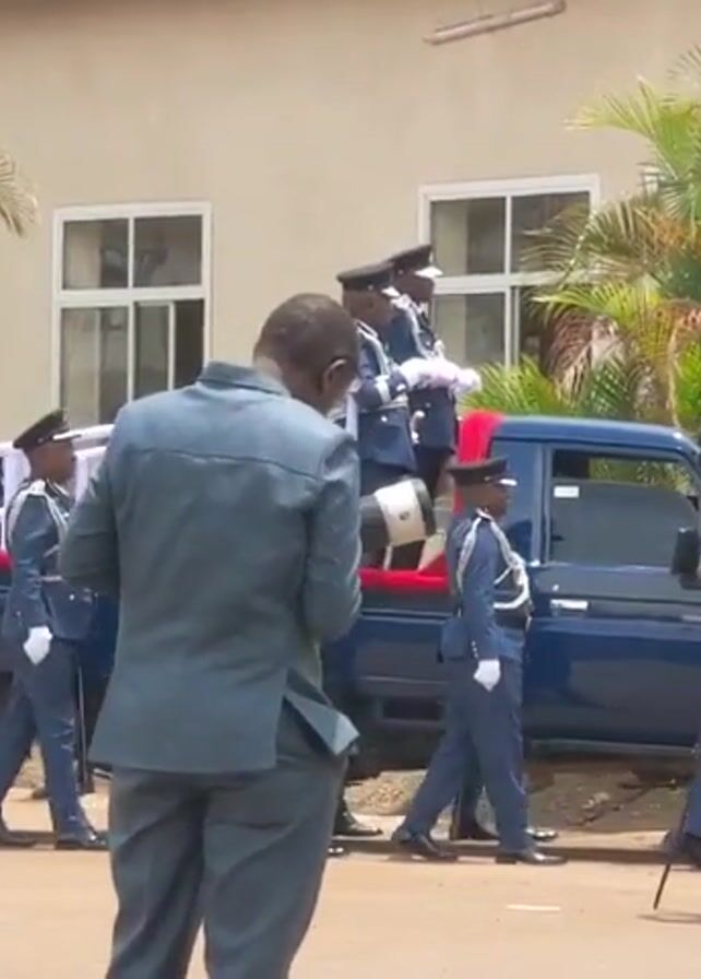 formal event taking place outdoors in front of a building with a flag. A man in a grey suit is standing with his back to the camera. To the left of him are many people in blue uniforms, standing in formation. They appear to be military or law enforcement personnel. To the right of the man is a dark blue pickup truck with several people in matching blue uniforms standing in the back. A cameraman is filming the scene. Palm trees flank the building.
