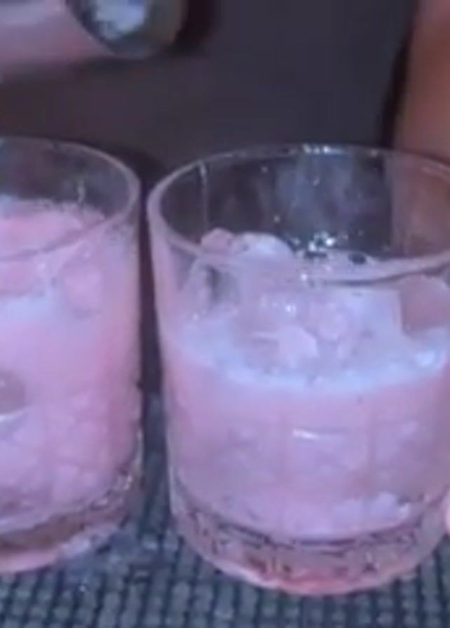 Two drinks with ice are being poured from a silver shaker by a bartender. The drinks are a light pink color. The bartender is wearing a vest and has a watch on their left wrist. The drinks are on a black bar mat.