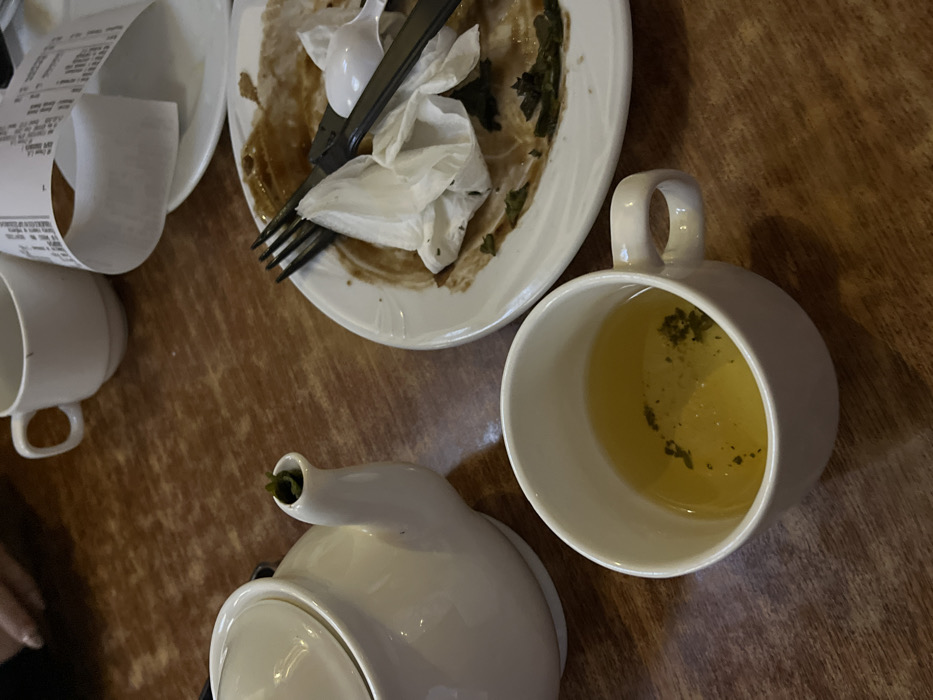 An overhead shot reveals a cluttered table. A mostly empty plate with silverware and a napkin rests beside another plate obscured by a receipt and cup. A teapot and a cup filled with a light liquid, possibly tea, with visible leaves, sit near the center. The table has a wood-grain texture.
