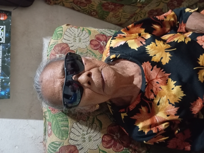 An elderly individual is seated indoors in Baron, Indonesia, facing forward