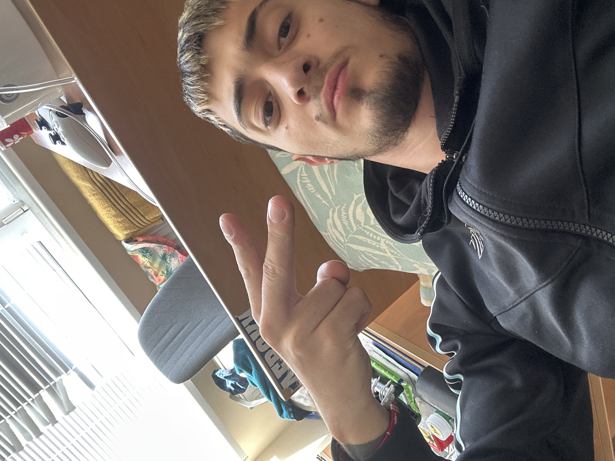The image captures a young adult male in an indoor environment, located in Varna, Bulgaria. The subject is depicted in a reclining or lying position, facing the camera with a neutral to slightly serious expression. He possesses short, light-colored hair with visible dark roots, dark eyebrows, and a trimmed beard including a soul patch. Multiple small facial moles are present. The individual is dressed in a black zippered hooded tracksuit jacket featuring light blue and white wavy stripes on the sleeves and a white winged emblem on the left chest. His left hand is raised, forming a "peace sign" with the index and middle fingers extended. The background shows a brightly illuminated room, dominated by natural light from a window fitted with white horizontal blinds. A wooden shelf system is visible behind the subject. The top shelf holds a grey ironing board, a folded colorful floral fabric, a yellow towel, a white gaming controller, a red-and-white cup with a floral pattern, and a translucent plastic item. Below this, a section of books and various other objects, including a white container with a red lid, are visible. A light blue pillow with a white leaf pattern is partially visible behind the subject's head.