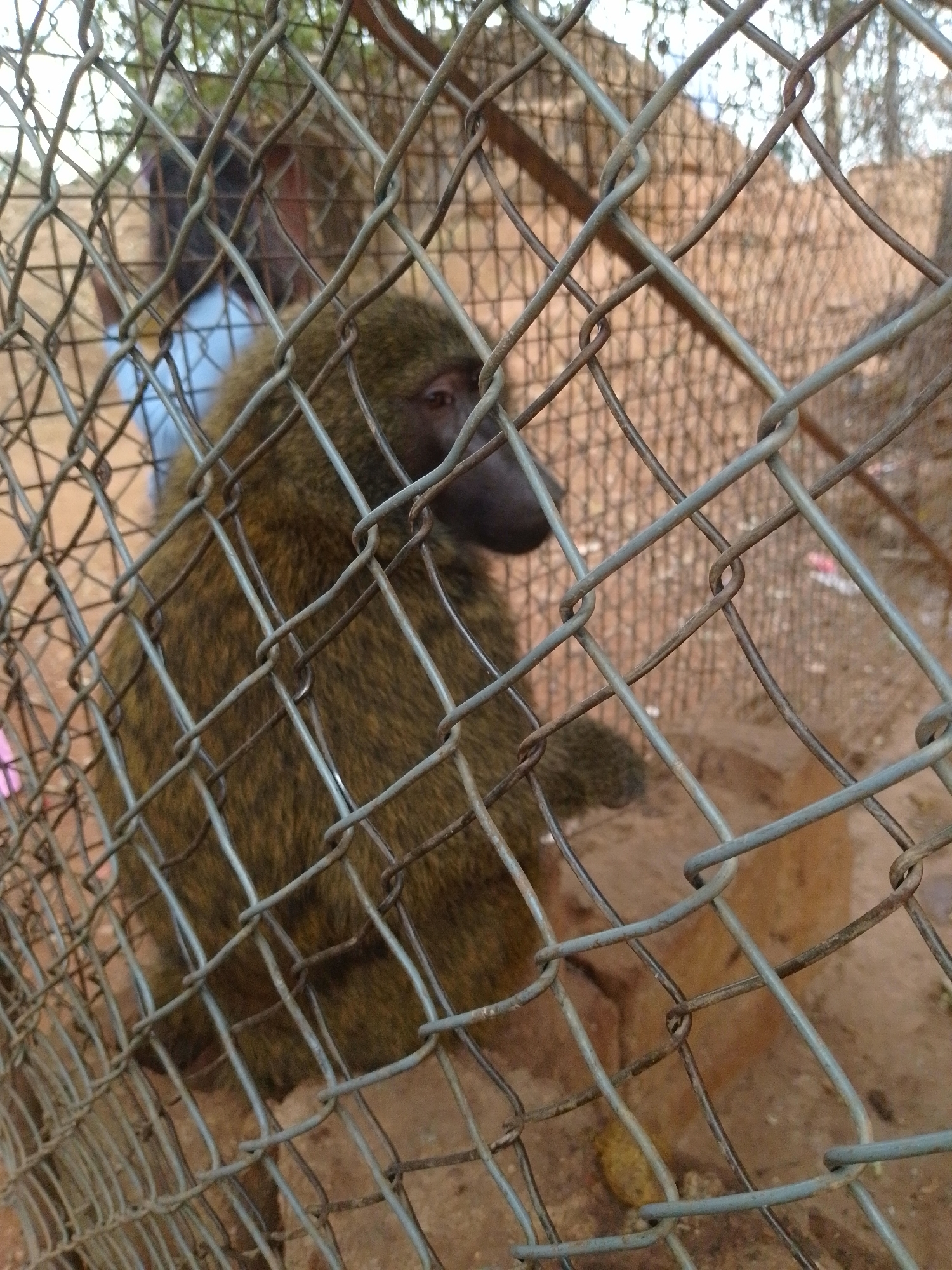 A baboon is observed through a chain-link fence. The animal is brown with a black face. Behind the fence, there is sandy ground and a structure with a wire mesh covering. A person wearing a blue shirt is visible in the background. The photograph was taken in Jos, Nigeria.