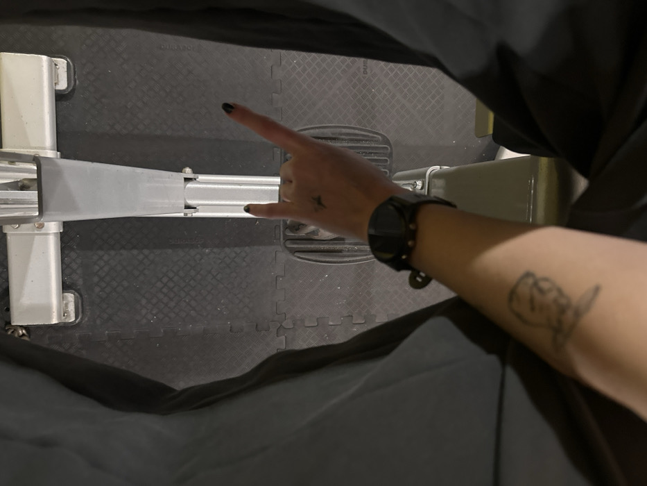 A first-person, downward-angled view captures an individual engaging with gym equipment in an indoor fitness facility