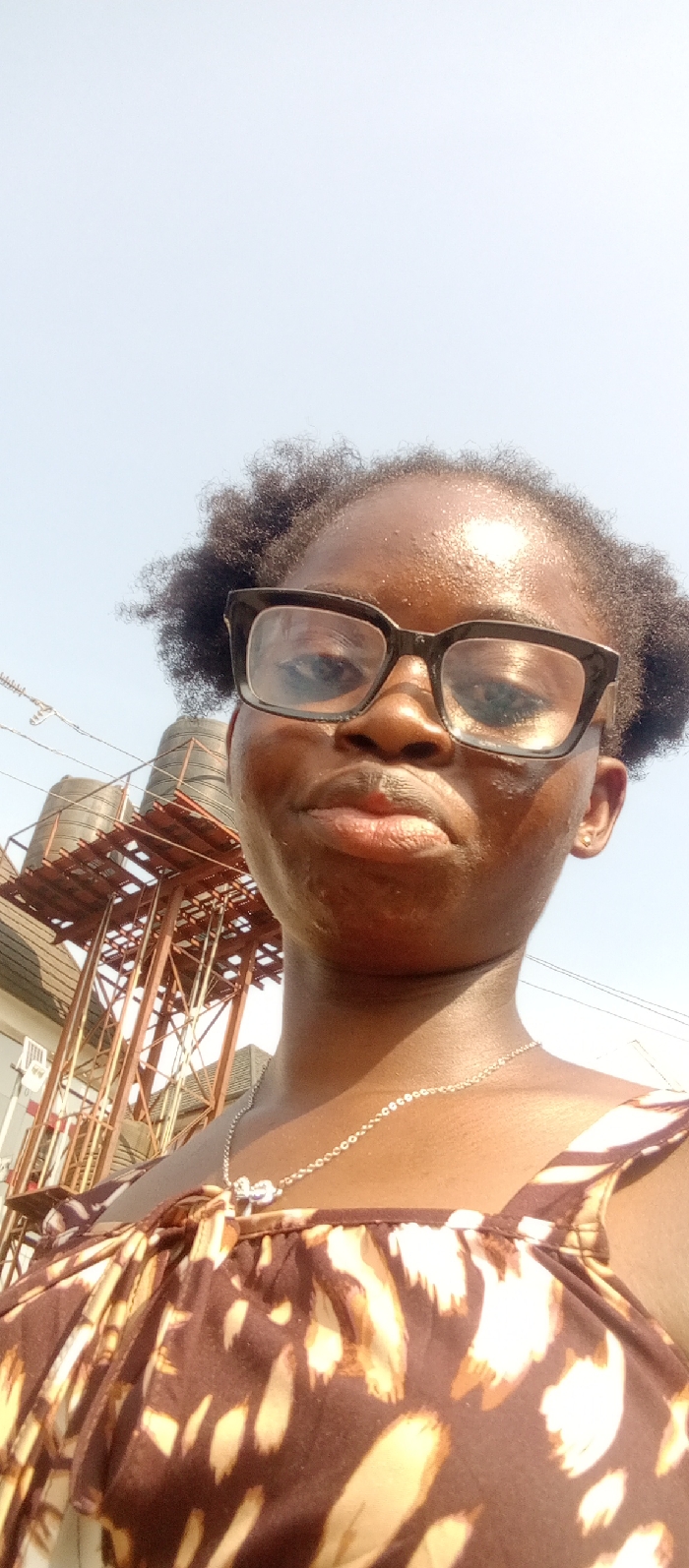 A young Black woman is pictured outdoors wearing large black-rimmed glasses. Her dark hair is in a short, textured style. She has a silver chain necklace on, and is wearing a brown and beige print tank top. Metal framework and tanks are visible in the background. The sky above is light blue and clear.