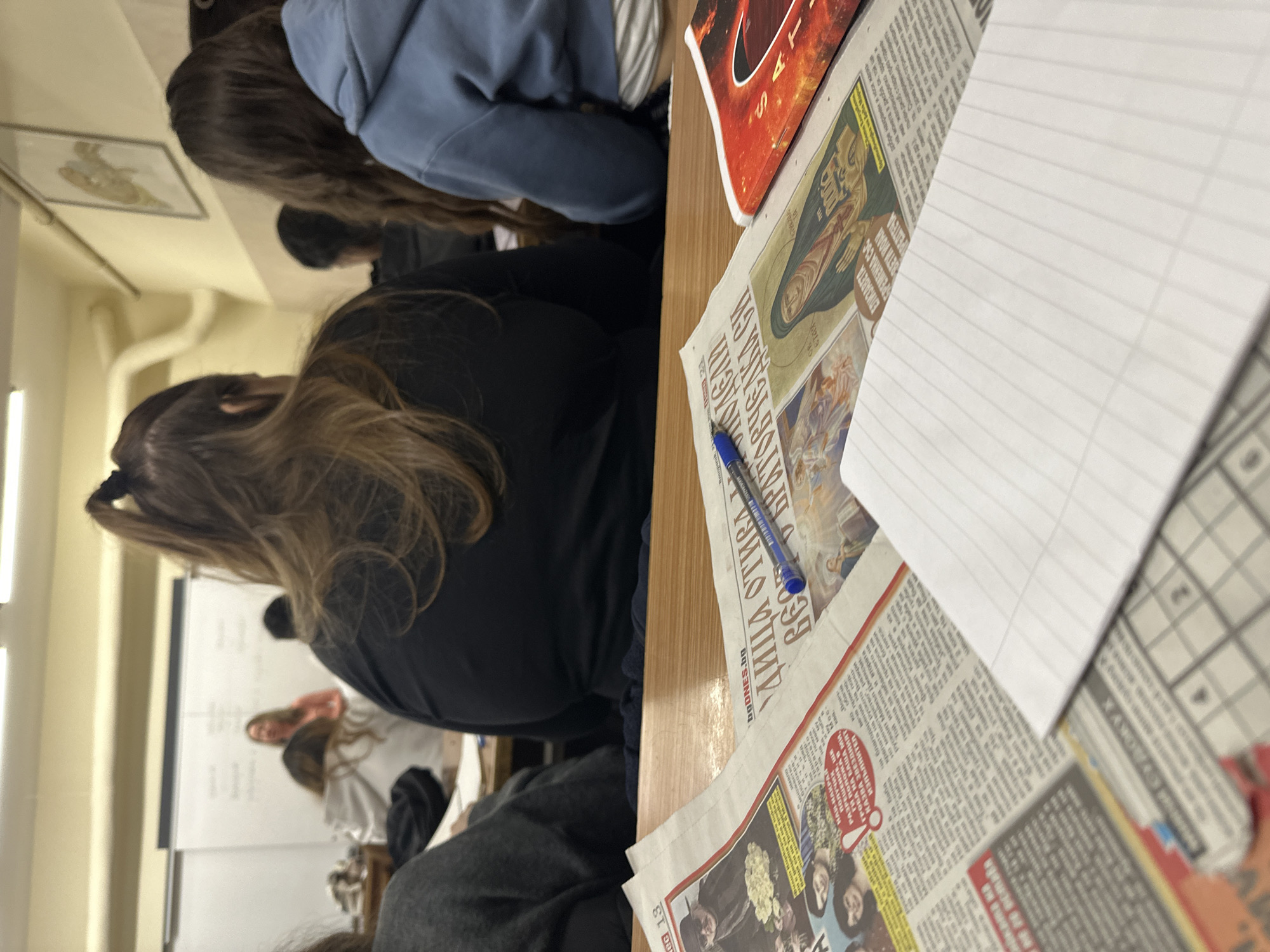 The scene depicts an indoor classroom or lecture hall in Stara Zagora, Bulgaria. The room features pale yellow walls, a fluorescent light fixture on the ceiling, and wooden desks. A whiteboard displaying faint text is visible at the front of the room, near which a blurred adult female, wearing a light-colored top, stands, presumably as an instructor. Several individuals, primarily students, are seated at desks, facing the front. In the immediate foreground, the back of a student with long brown hair tied in a ponytail, wearing a black long-sleeved top, is visible. To the right, another student with long brown hair is seen from behind, wearing a light blue hooded sweatshirt. On the wooden desk in front of the viewer, two folded newspapers with headlines and text in Bulgarian are laid out. A blue ballpoint pen rests on one of the newspapers. This newspaper displays images, including a man in a hat holding flowers and a religious icon of the Virgin Mary. A ruled white notebook is partially open next to the newspapers, and part of a grid-based puzzle is visible beneath it. A book with a red and black cover, showing "SAT..." as part of its title, is positioned to the right of the newspapers. A framed picture, possibly an anatomical illustration, hangs on the wall to the right, behind the students.