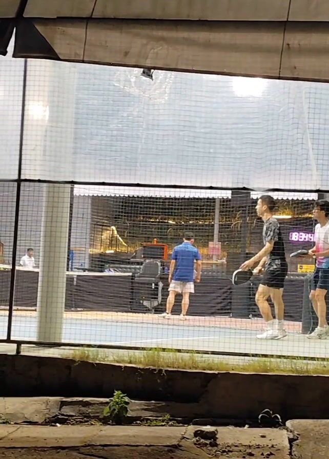 n outdoor padel court at night. Two men in athletic wear are playing. One man is wearing a black shirt and shorts, while the other wears a light blue shirt and dark shorts. A metal fence surrounds the court. Outside of the fence, there is pavement and a small motorcycle is parked. A person sits at a table in the background on the court.