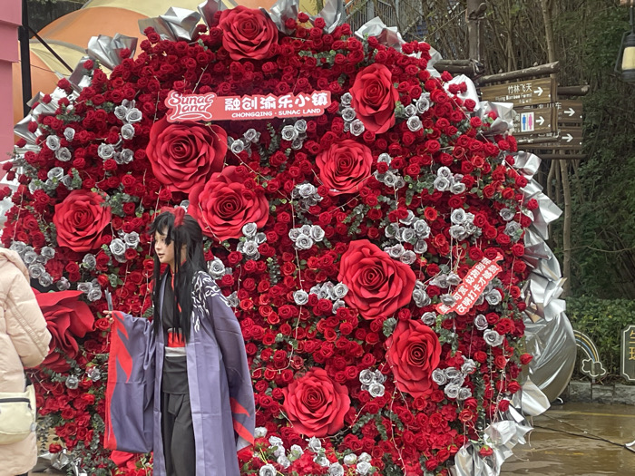 The image depicts an outdoor scene at Chongqing Sunac Land in the Chongqing High-tech Zone, China. A prominent, large circular floral display occupies the center-right, approximately 2.5 to 3 meters in diameter. It is densely adorned with numerous artificial red roses of varying sizes, including several large paper or fabric roses, interspersed with smaller silver-colored flowers or foliage. The display is framed by a ruffled silver-colored material. A white sign at the top center of the display reads "Sunac Land 融创乐园 SUNAC LAND CHONGQING," and a smaller red banner with white text and cartoon characters is visible on the lower right. To the left of the floral display, a person in elaborate cosplay attire stands, facing slightly right. The individual wears a long, dark purple robe with red and light grey/white patterns on the sleeves and front, over a black undershirt and black pants. Their long black hair features red accents, and they hold a small, fan-like prop in their right hand, appearing to pose. Partially visible on the far left is the torso and arm of another person wearing a light brown padded jacket. In the upper right background, a rustic wooden signpost with multiple directional arrows is visible, pointing towards "竹林飞天" (Bamboo Forest Flying) and a "Ferris Wheel," alongside restroom symbols. Dense green foliage and an antique-style street lamp are also present in the background. The ground surface appears paved.