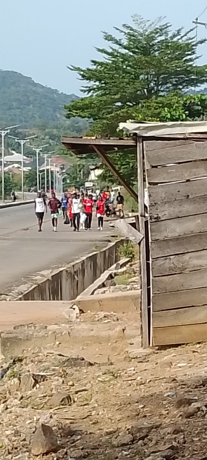The image captures an outdoor daytime scene on a paved road in the city of Lokoja, Nigeria. In the foreground, on the right, a crudely constructed wooden shed or kiosk, featuring horizontal planks and an angled support structure for a roof (partially visible), stands on uneven, rocky, unpaved ground littered with debris and sparse vegetation. A concrete drainage channel or culvert separates this foreground area from the main road. On the asphalt road, which recedes into the background, a group of approximately 10-15 individuals, predominantly young adults, are walking or light jogging away from the viewer. They are dressed in athletic or casual wear, with notable individuals in white and red tops, and various colored shorts. Along the left side of the road, a series of tall streetlights equipped with solar panels line the thoroughfare. Behind these lights, residential buildings with light-colored roofs are visible. The background features a large, dense green tree canopy on the right, behind the wooden structure. Further in the distance, lush, vegetated hills rise against a clear, light blue sky. The scene is brightly illuminated, indicating daytime conditions.