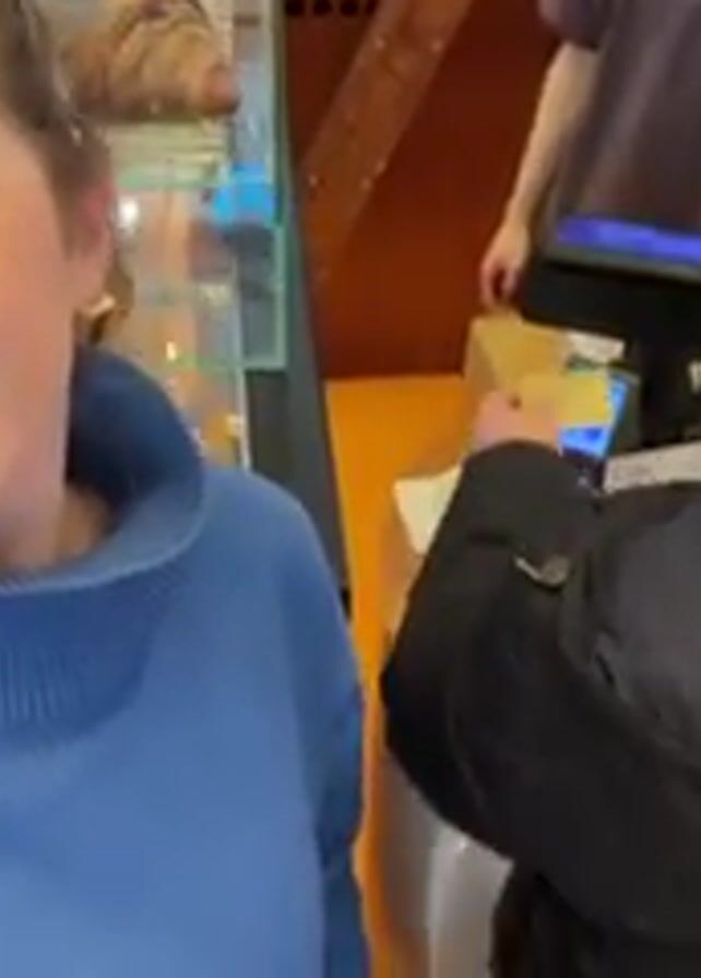 A woman wearing a blue sweater and sunglasses on her head smiles at the camera. She is standing at a bakery counter, with pastries in a glass display behind her. A man in a jacket is at the counter paying with his phone. A barista stands behind the counter. The environment is brightly lit.