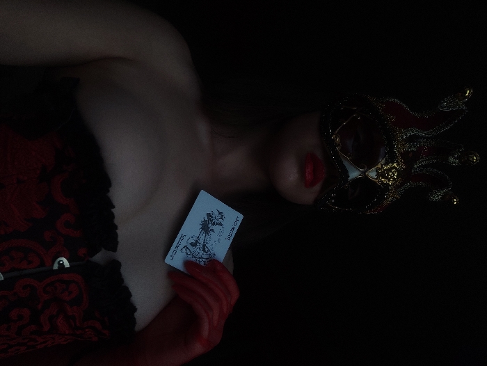A person is depicted from a low-angle perspective against an undifferentiated, dark background. The individual wears a red, black, and gold Venetian-style jester mask covering the upper face, with prominent red lipstick on the lips. The mask features three gold-tipped points extending upwards from the crown. Below the neck, the person wears a red and black corset with intricate patterning and visible lacing/fasteners on the right side. The upper chest and left shoulder are bare. The right hand, covered by a red glove, holds a white playing card displaying the "JOKER" insignia and a jester illustration, positioned against the chest. The left hand and arm are visible, bare, with no specific action. The environment is unidentifiable; no architectural features, landmarks, or specific details of Kyiv, Ukraine, are present to ascertain a precise location within the city. The lighting is dim, emphasizing the subject and obscuring the background entirely.