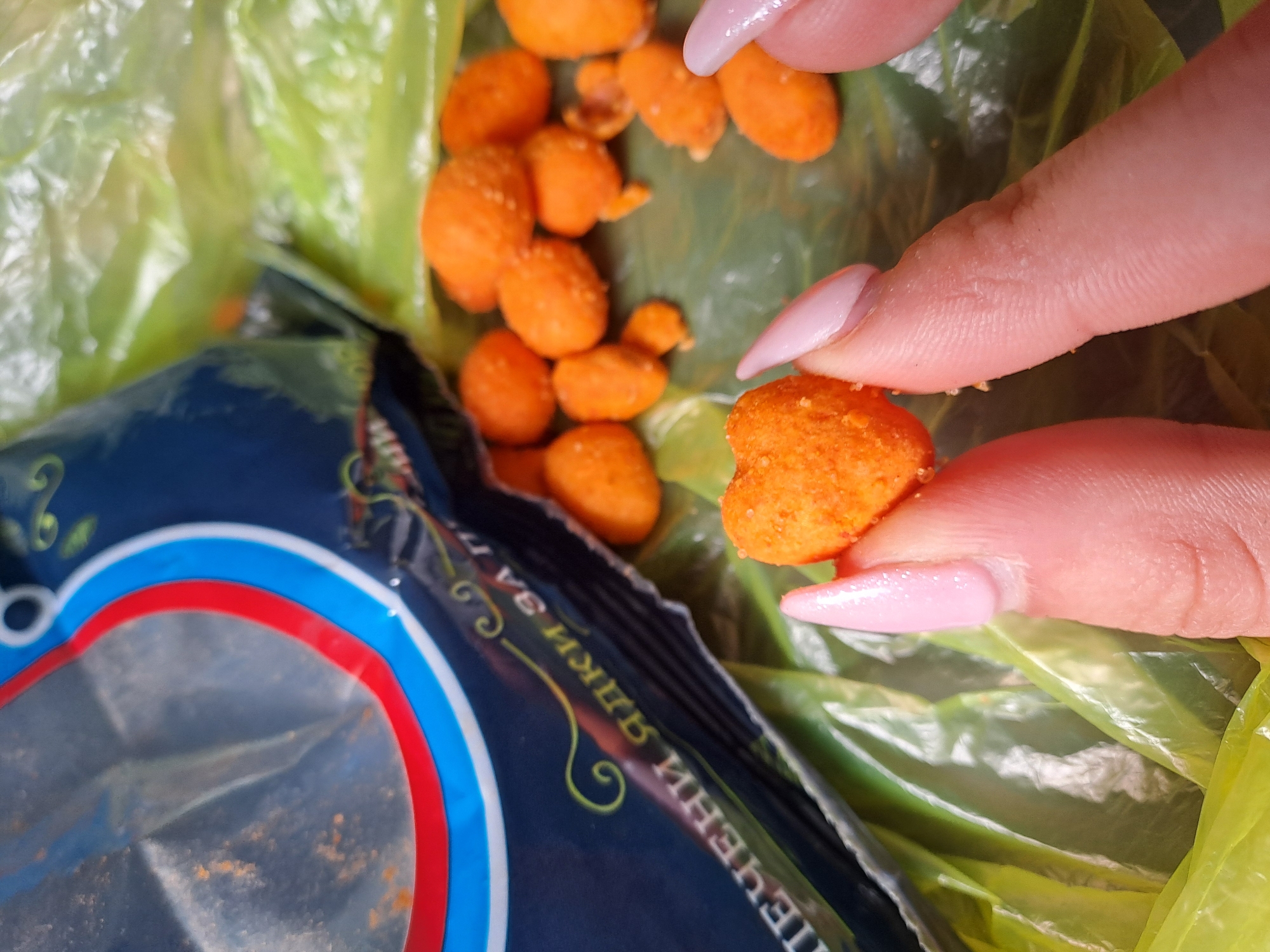 A close-up shot shows a hand holding an orange, round, peanut snack with a textured surface. The hand has pale skin and long, pointed fingernails painted a light pink color. Several other similar peanut snacks are scattered in the background, inside of a light green plastic bag. Next to the bag is a blue package with a white and red circle on its side, with text in an unknown language and decorative scroll work on the package.
