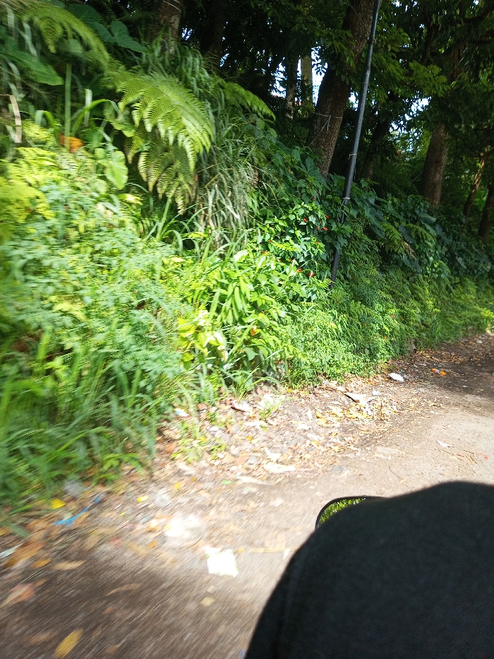 The image depicts a roadside scene in Kandenuwara, Sri Lanka, captured from a moving perspective. A dense, green embankment of varied vegetation, including large ferns, shrubs, and tree trunks, occupies the left and central-upper portions of the frame. A slender, dark pole is vertically positioned amidst the foliage on the right side of this embankment. Within the green growth, sparse red floral elements or berries are visible. An unpaved, earthen path or road runs horizontally across the lower half of the image, showing exposed soil, scattered dry leaves, and incidental white and blue refuse. A dark, indistinct object, consistent with a vehicle component or clothing, is present in the lower right foreground, indicating the photographer's point of view. Natural daylight illuminates the scene, and motion blur is evident, primarily in the foreground and left mid-ground, suggesting active movement during capture.