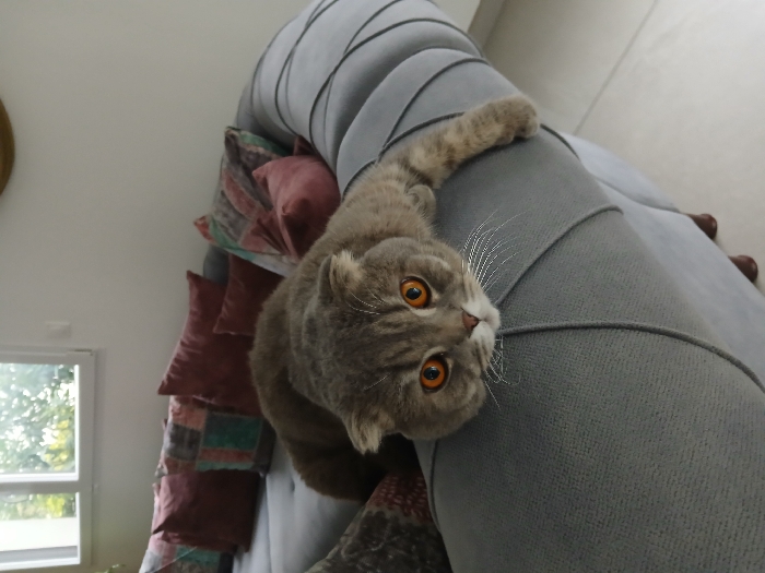 The scene depicts a domestic interior, consistent with a modern residential living space. The specific address within Illkirch-Graffenstaden, France, is not discernible from the visual information provided. A short-haired cat with grey-brown tabby markings and notably large, bright orange-amber irises occupies the foreground. The cat's ears appear small and low-set. Prominent white vibrissae extend from its muzzle. The cat is positioned prone, with its head and front body resting on the upper backrest of a large, grey upholstered sofa. Its head is lowered, looking directly at the viewer, with its chin nearly touching the sofa's armrest. One front paw is draped over the front edge of the armrest. The sofa is upholstered in a textured grey fabric, featuring a channel-tufted or ribbed design on its backrest and armrests. Several throw pillows are scattered on the sofa. Some are solid maroon/burgundy, while others exhibit a patterned design incorporating maroon, teal, and other muted colors. In the background, a plain white wall is visible. To the left, a white-framed window allows natural light into the room and shows blurred green foliage outside, indicating an exterior view with vegetation. A light-colored floor, possibly tiled or polished, is partially visible in the lower right quadrant. No human subjects are present in the image.