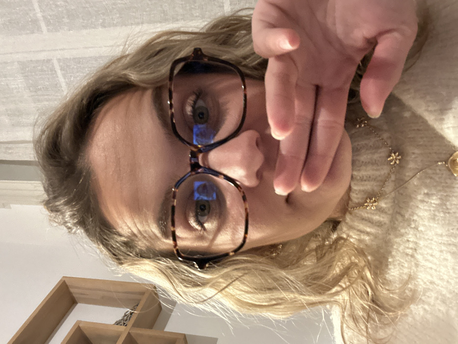 A person with blonde, wavy hair wears tortoiseshell glasses and a cream-colored sweater