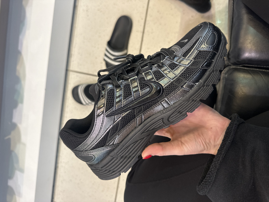 The scene depicts a retail shoe environment, consistent with a store in Tunbridge Wells, United Kingdom. A person's left hand, with short fingernails painted red, holds a black Nike P-6000 sneaker. The sneaker features a black mesh upper, iridescent metallic silver-black synthetic overlays, and a black Nike swoosh. The sole unit is black and heavily textured. The person is wearing black clothing, specifically black leggings or trousers and a black long-sleeved top with a dark, possibly fleecy, cuff. The floor is covered with light-colored, square tiles with dark grout lines. In the background, on the floor, rests a pair of black Adidas Adilette slides with three white stripes on the straps; a black sock is visible on the foot wearing one slide. A dark, possibly black, leather or faux-leather cushioned seat with visible stitching and creases is partially present in the lower right. A low, white display unit is visible along the background wall on the left.