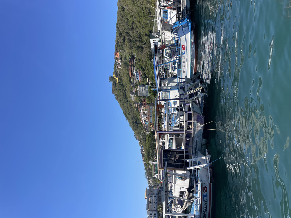 Boats line a dockside, their white hulls and blue accents standing out against the green water. Behind them, a hill covered in lush trees is dotted with houses. The sky is a clear, vibrant blue. The composition is rotated counterclockwise, creating a somewhat tilted perspective.