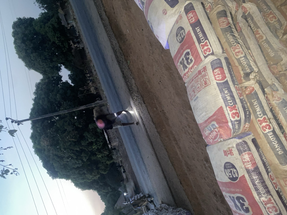Stacked cement bags line a dusty road. The bags, primarily white with red and blue accents, are labeled "3X Cement" and "Dangote Cement," marked with a weight of 42.5N. In the background, a person stands on the road, seemingly illuminated by a light source. A tree and power lines are on the other side of the road. The sky fades into a blue hue, possibly indicating early morning or late evening.