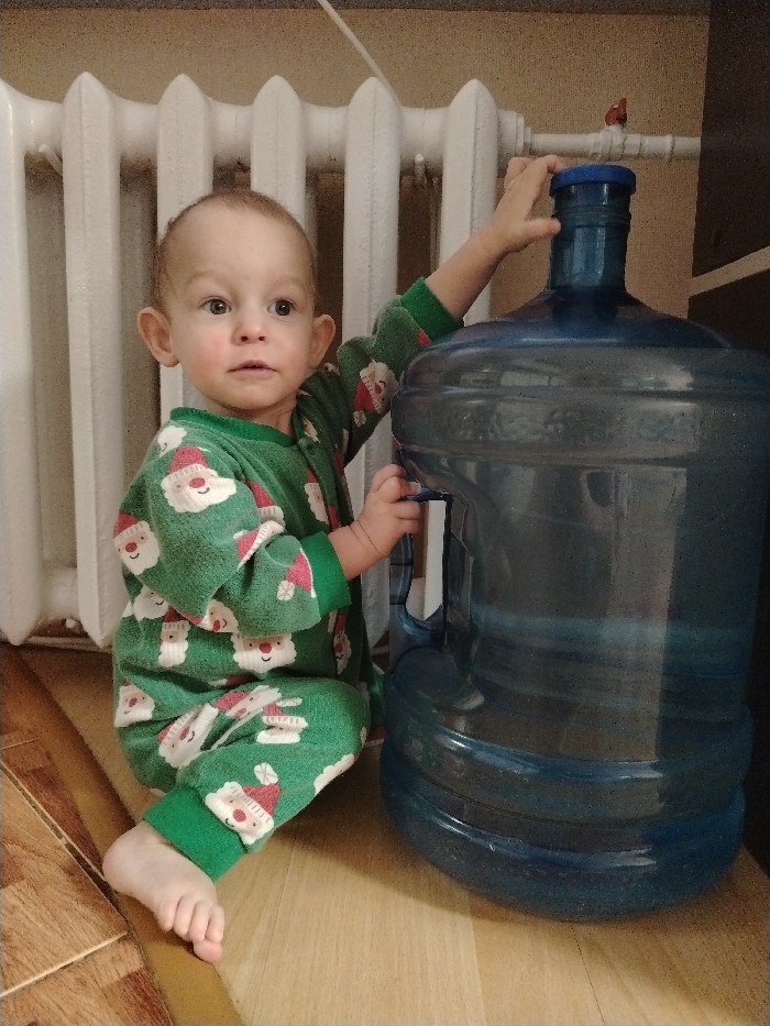 An infant or toddler, estimated to be between one and two years of age, is depicted in an indoor residential setting in the city of Chaikovsky, Russia. The child, with light skin and short light brown hair, is dressed in a green, long-sleeved, footless one-piece pajama set adorned with a repeating Santa Claus pattern. The child is positioned in a low crouch or seated posture on a light-colored wooden plank floor, looking towards the camera with a neutral expression. To the child's immediate right, a large, translucent blue plastic water bottle, resembling a 5-gallon cooler jug, rests on the floor. The child's right hand is placed on the blue cap of this bottle, while the left hand grips an integrated handle on the bottle's side. The bottle appears to contain a quantity of water, with a visible water line. In the background, behind the child and extending to the left, a white, multi-section cast-iron radiator is mounted against a light-colored, textured wall. Above the water bottle, a white pipe with a small red valve is visible, appearing to be part of the heating system. A thin white cable or wire runs across the upper part of the background. The child's bare feet are visible on the wooden floor.