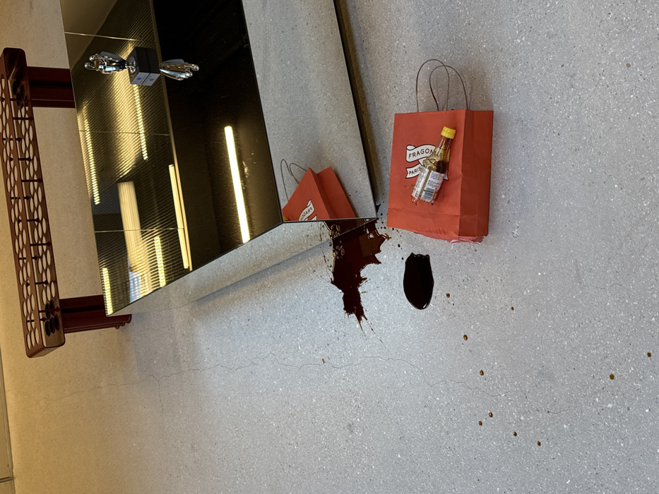 An indoor scene in Montreuil, France, features a minimalist setting with a spillage incident. The floor is light gray, possibly concrete or terrazzo, exhibiting fine surface cracks. A large, rectangular coffee table with highly reflective mirrored surfaces dominates the midground, prominently reflecting overhead linear lighting fixtures. Behind this table, a dark red, slatted bench or decorative shelf with numerous circular cutouts is visible. On the floor, adjacent to the mirrored table, is a significant dark reddish-brown liquid spill. This spill forms an irregular, somewhat splattered pattern, approximately 40 cm in its longest dimension, and includes a separate, darker puddle roughly 15 cm long. Scattered small droplets of the same liquid extend across the foreground of the floor. Two red paper shopping bags are on the floor. One bag is positioned near the origin of the main spill, partially reflected in the mirrored table's edge. The other red shopping bag, bearing the visible "FRAGONARD PARIS" logo, lies horizontally further from the spill. Resting on this second bag is a small, clear glass bottle with a yellow screw cap and a product label, which appears intact. Centered on the mirrored coffee table's surface is a small, silver-colored trophy or figurine mounted on a dark square base, with its reflection clearly visible below it. No individuals are present in the depicted scene.