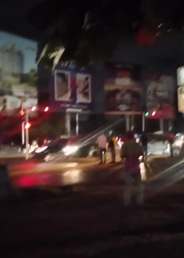 blurry night scene of a city street. There are billboards on either side of the road, and cars are moving. The traffic light is red. A small ambulance-like vehicle with flashing red lights can be seen in the distance. There is a tree trunk on the left and some construction material in the foreground. Pedestrians cross the street.