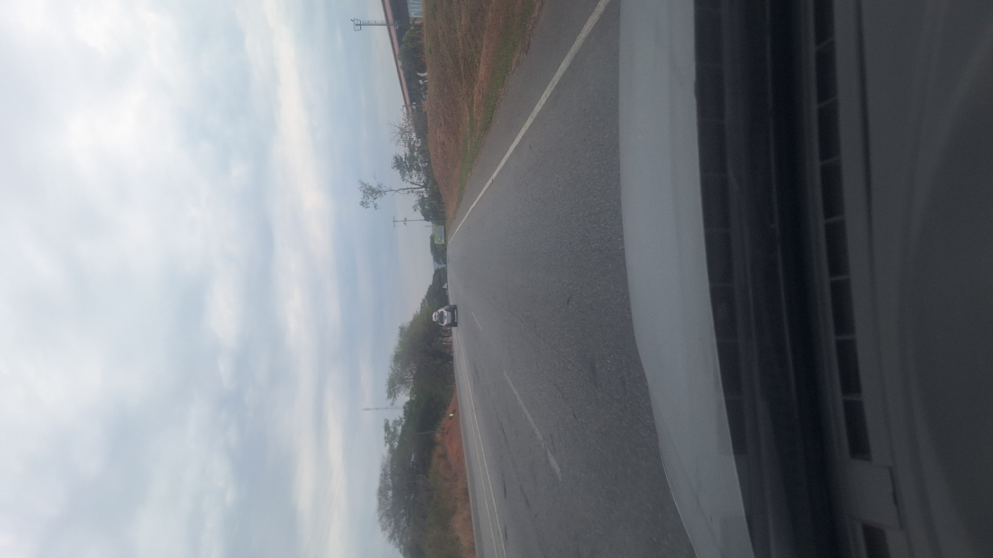 The image depicts a view from inside a vehicle traveling on a road in Orupe, Venezuela. The road has a white line dividing lanes, with sparse vegetation on either side. A car is visible ahead on the road. The sky is overcast. The interior of the vehicle is visible on the right side of the frame, showing a vent.