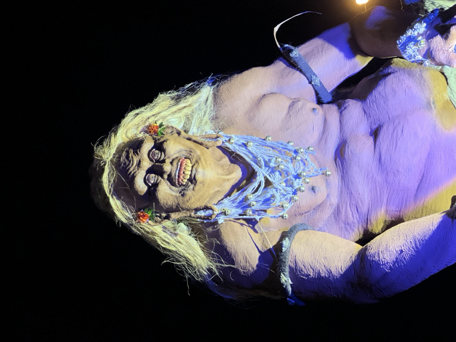 The image depicts a large, anthropomorphic effigy, likely an Ogoh-Ogoh, illuminated at night in Munggu, Indonesia