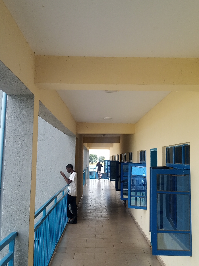 This image depicts a brightly lit outdoor corridor or veranda of a building located in Hayin Banki, Nigeria