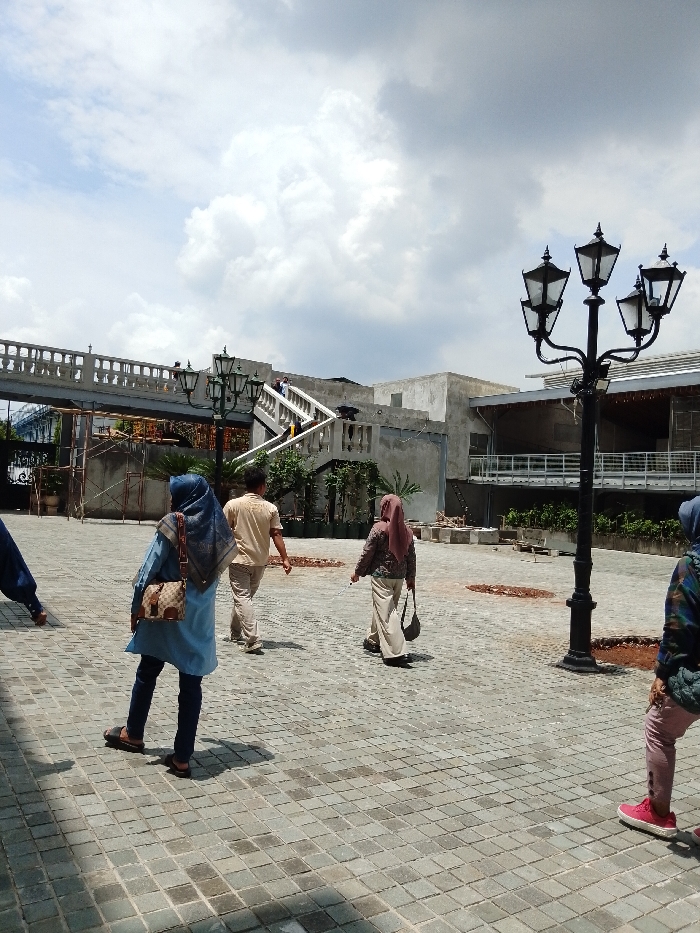 The scene depicts an outdoor paved area, likely a public plaza or part of a developing complex, located in Ngadirejo, Indonesia. The ground consists of grey square pavers with scattered reddish-brown dirt patches, indicating ongoing construction or landscaping. The sky is partially cloudy with significant white and grey cumulus clouds. In the mid-ground, a large black streetlight with four lantern-style lamps is prominently positioned on the right. Another similar streetlight is visible further back on the left. The background features several structures: an elevated pedestrian bridge with white balustrades extends across the left side, appearing to be under construction with scaffolding visible beneath. A concrete staircase with matching white balustrades descends from an upper level towards the paved area. Adjacent to these structures are unfinished or raw concrete buildings. On the far right, a building with a grey sloped roof and a white railing balcony on its lower level appears more complete. Potted plants in green bags are arranged near the base of the stairs and along the buildings, suggesting landscaping. Six individuals are visible in the image. 1. **Foreground Left (partial):** A person's lower body is visible, wearing dark blue pants and dark sandals. 2. **Mid-Left:** A female, viewed from behind, wears a light blue long-sleeved tunic, dark blue pants, and a blue patterned hijab. She carries a light brown patterned shoulder bag. She is walking towards the background. 3. **Mid-Center:** A male, viewed from behind, wears a light tan collared shirt and tan pants. He is walking towards the background, slightly to the right of the female in blue. 4. **Mid-Right:** A female, viewed from behind, wears a dark patterned top, light tan wide-leg pants, and a dark pink/maroon hijab. She carries a black shoulder bag. She is walking towards the background, to the right of the male. 5. **Far Right (partial):** A person's lower body is visible, wearing patterned pants, possibly pink, and bright red sneakers. 6. **Background (on stairs):** Two indistinct individuals are visible on the concrete staircase; one appears to be wearing white clothing, the other dark. All foreground individuals are walking away from the viewer across the paved area. No direct interactions are discernible among them.