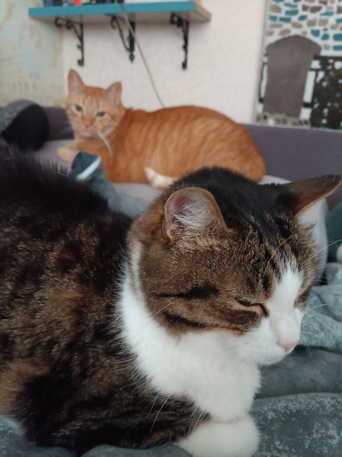 The scene depicts an interior view within a domestic residence in the city of Unknown, Unknown. Two felines are present. In the foreground, a brown and black striped tabby cat with significant white markings on its chest, face, and paws rests on a gray, textured blanket or upholstery. Its eyes are closed, and its front paws are tucked beneath its body. In the mid-ground, a ginger tabby cat is lying down on the same surface, appearing less in focus. Its eyes are partially closed. A dark gray sock is visible between the two cats, partially obscured by the foreground feline. The background reveals a light-colored wall adorned with a light blue shelf supported by two black decorative brackets. A white cable is visible descending from the shelf area. To the right, a section of patterned wall covering or fabric, displaying brown, black, and light gray tones, is present. Both cats are in a state of rest.