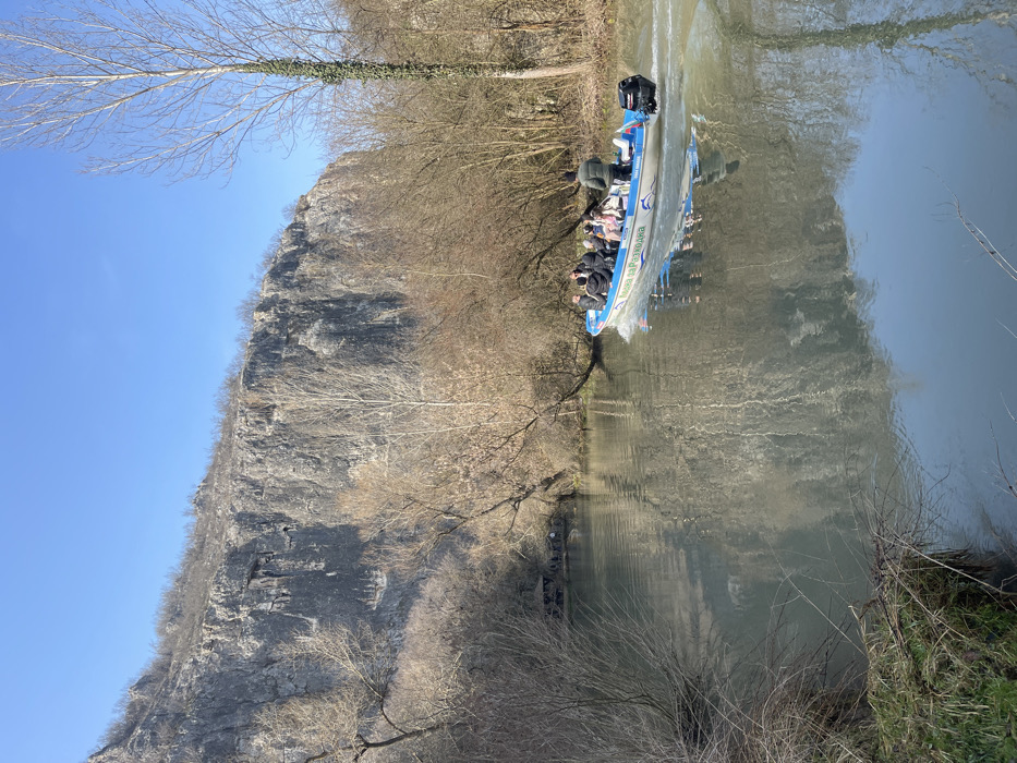 - "The image depicts an outdoor natural scene in Petrevene, Bulgaria, featuring a motorboat on a river beneath a large rocky cliff" by FM-4unv33, licensed under CC BY 4.0