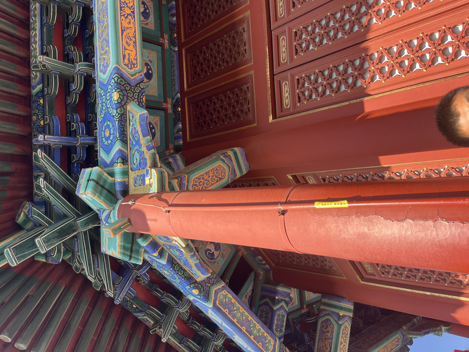 This upward-angled photograph depicts the ornate architectural details of a traditional Chinese imperial building, located in the Dongcheng District of Beijing, China, strongly indicative of structures within the Forbidden City. The central element is a large, cylindrical red-painted pillar, exhibiting noticeable paint flaking and cracking. A thin, dark cable runs vertically along the pillar, secured by two white clips. A small, rectangular yellow sticker with black vertical text is adhered to the pillar beneath the lower clip. Above the pillar, an elaborate system of interlocking wooden bracket sets (dougong) and beams forms the eaves structure, adorned with vibrant painted patterns in blues, greens, reds, and gold, featuring floral, geometric, and possibly mythical creature motifs. To the right of the pillar, a red wall section is visible, containing multiple dark red windows with intricate geometric lattice patterns and accented with gold trim. The bottom edge of the frame partially shows the top of a human head, specifically the forehead and hair, looking upwards. The scene is illuminated by bright sunlight, casting distinct shadows and highlighting the colors, with a sliver of clear blue sky visible at the upper left.