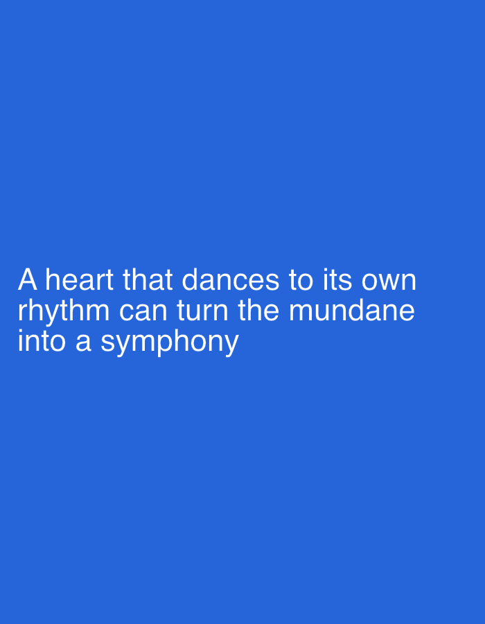 The image displays white sans-serif text centered on a solid, deep blue background. The text reads: "A heart that dances to its own rhythm can turn the mundane into a symphony". There are no people, subjects, objects, or actions depicted beyond the text itself. The environment is a digital graphic with no discernible physical location or setting, therefore, no specific location in Yakutsk, Russia, is identifiable from the image content.