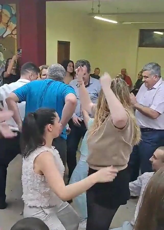 group of people dancing in an indoor space. Most of the visible dancers are adults, with varying ages and dress styles. The room appears to be a hall or event space, with decorations like balloons visible on the ceiling. There is a painting or mural on one wall. People are gathered around watching and some are recording with their phones. The general atmosphere seems festive and celebratory.